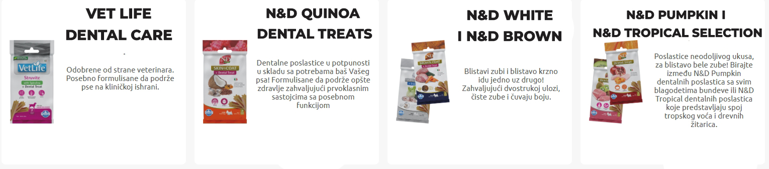 Farmina je kao inovativni lider u stvaranju proizvoda za svaku specifičnu potrebu ljubimaca ovog puta uspela da unese revoluciju i među poslastice: sada i psi sa alergijama, psi sa prekomernom težinom ili problemima sa varenjem mogu da uživaju i u poslasticama što je bilo nezamislivo! Dijetetske poslastice koje i istovremeno čiste i neguju zube i desni.